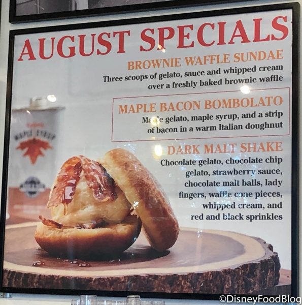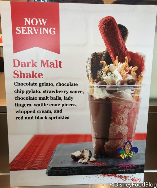 Accompanying the Brownie Waffle Sundae and the Maple Bacon Bombolato, the Dark Malt Shake is making its delicious debut. The chocolate gelato and chocolate chip gelato is mixed with strawberry sauce and topped with whipped cream, chocolate malt balls, waffle cone pieces, lady fingers, and red and black sprinkles. (YUM!!!)