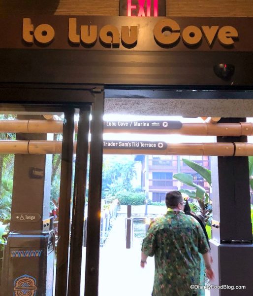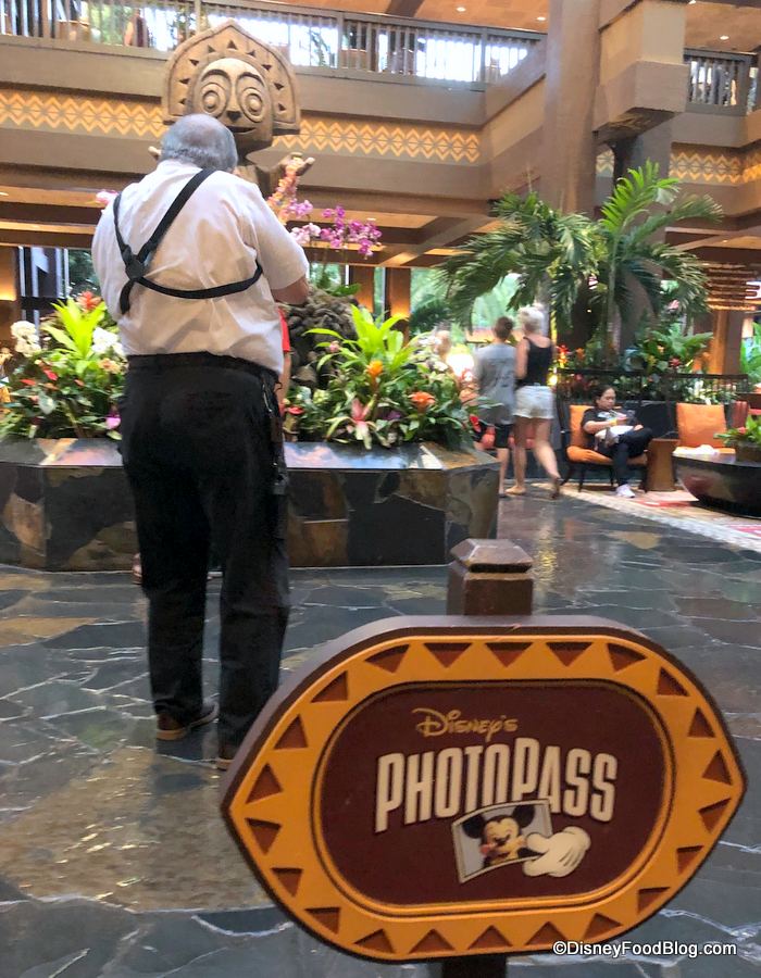 After checking in, we were told we could pose for a PhotoPass pic with the Poly Lobby’s central tiki figure (that’s the carved gentleman in the back, not the friendly guy with the camera) or follow the signs for Luau Cove.