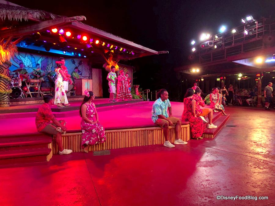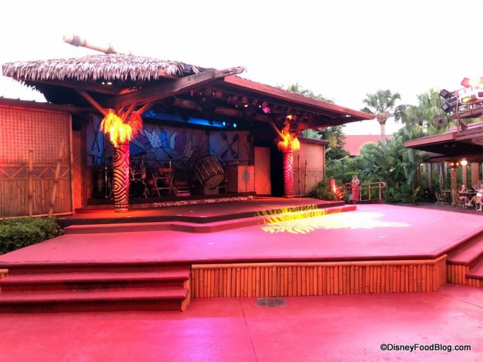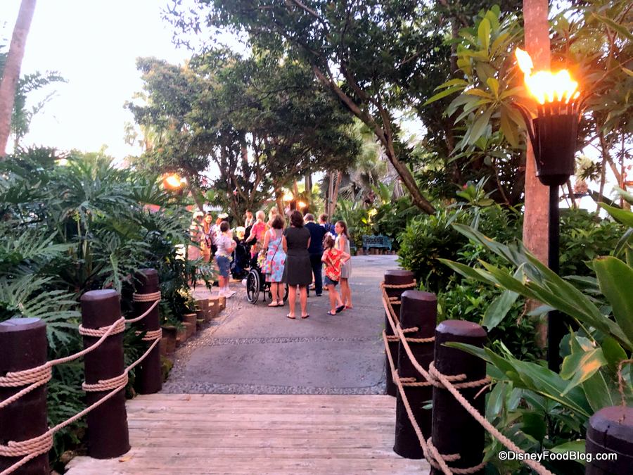 Just before you enter Luau Cove, there’s a large waiting area (outdoor with no covering) where you’ll hang out until cast members begin guiding guests to their pre-assigned tables.