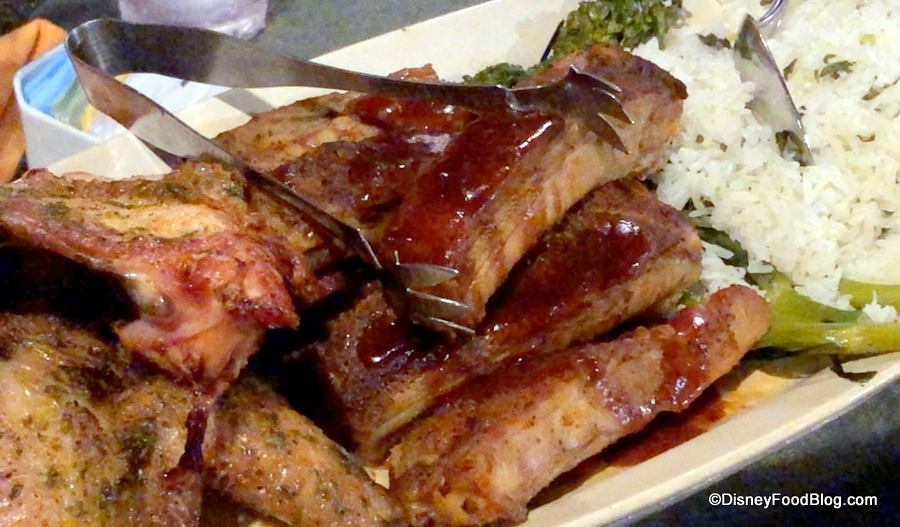 The Main Course is a platter that consists of a bed of Coconut-Jasmine Rice, Roasted Broccolini with Basil-Olive Oil, Aloha Pulled Pork. Polynesian Barbecued Ribs, and Roasted Chicken.