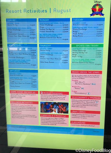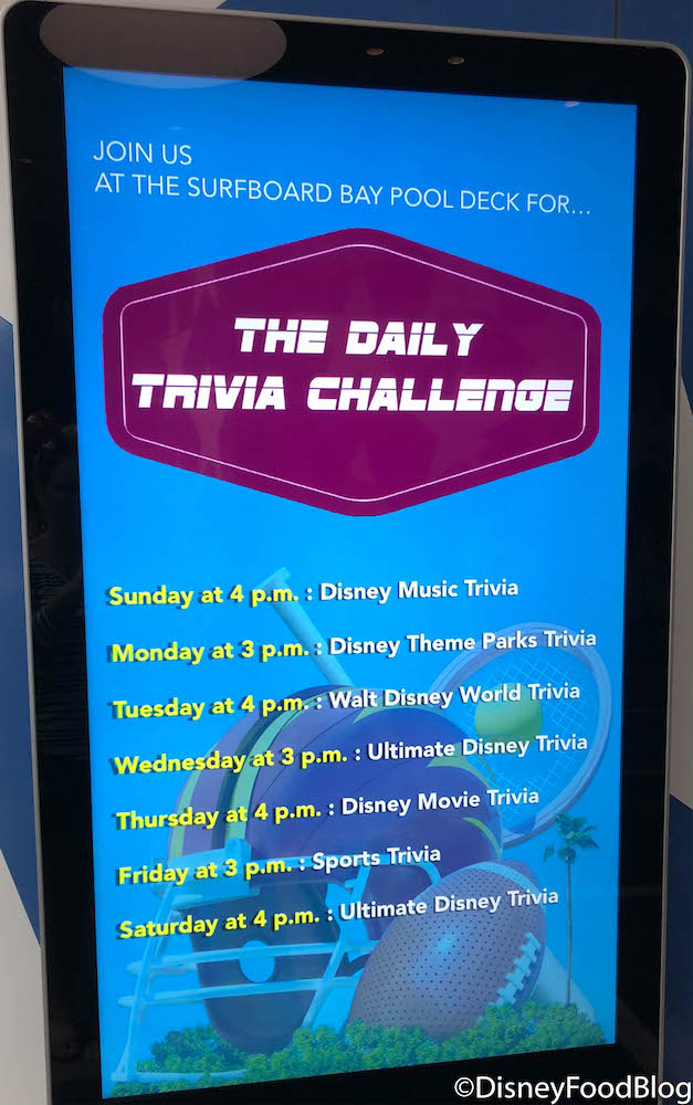 There was also an advertisement for the Daily Trivia Challenge at the Surfboard Bay Pool Deck. We’re pretty great at that Disney Theme Parks Trivia, you know!!