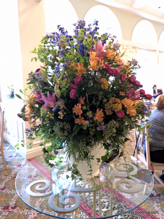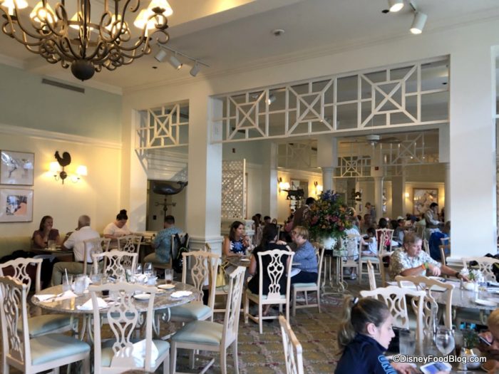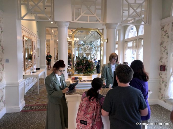 The atmosphere of Grand Floridian Cafe echos the Victorian tones of the entire Resort. Flowered wallpaper is layered with heavy white moldings, patterned carpets, and columns. The check-in desk is relatively small, but since this isn’t an overly-crowded restaurant (most of the time!), that’s okay!