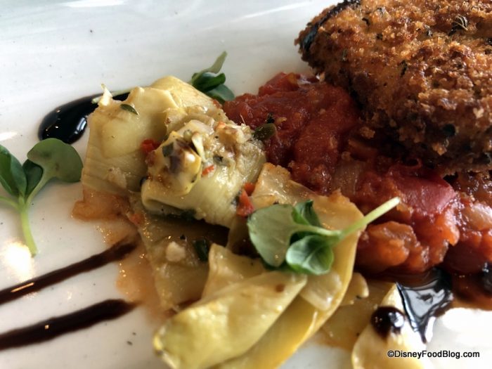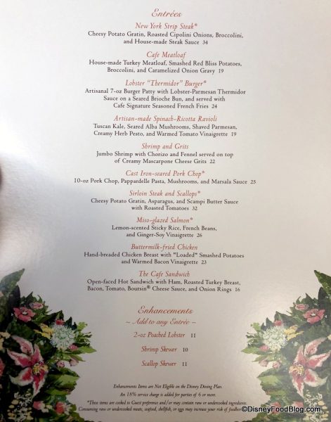 Enhancements (e.g. extra sides that Disney introduces so you’d have to spend more than what your Disney Dining Plan includes) include Poached Lobster and/or Shrimp and Scallop Skewers.
