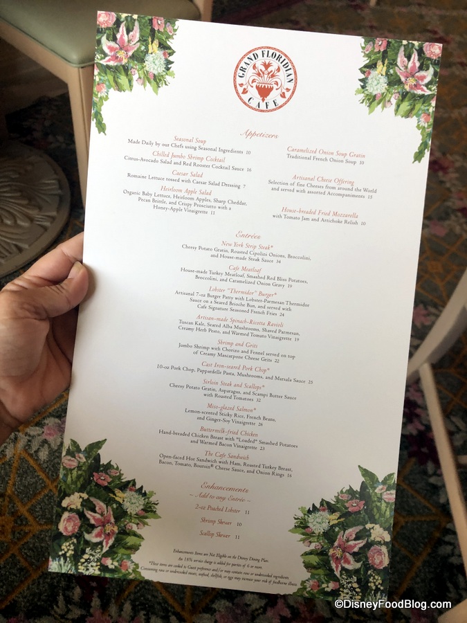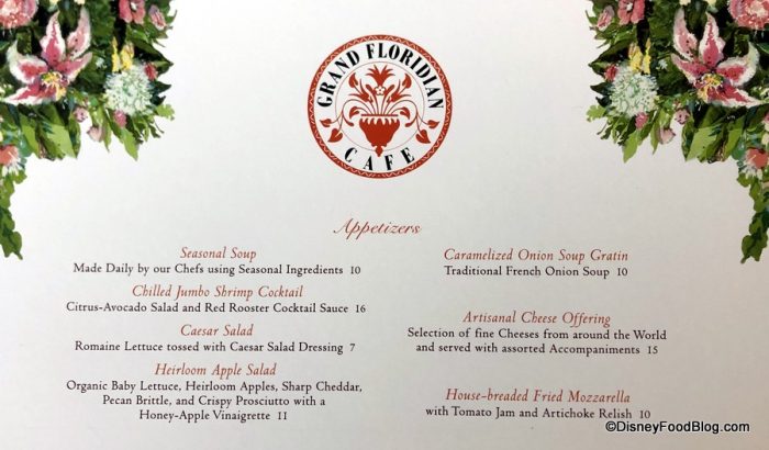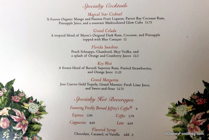 The menus at Grand Floridian Cafe keep the floral theme going, and they’re really pretty. In a way this design and the font used on the menus are fancier than the restaurant actually is in spirit. There are plenty of Specialty Cocktails here, including the Key West and Florida Sunshine.