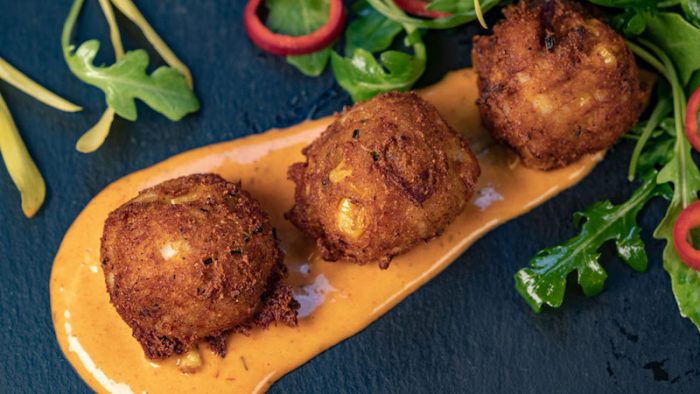 Once your Doom Buggy drops you off at Blue Bayou Restaurant, be sure to be on the lookout for the Dynamite Seafood Hush Puppies. These are spicy hush puppies served with shrimp, tasso ham, corn, Bloody Mary aïoli, and greens.