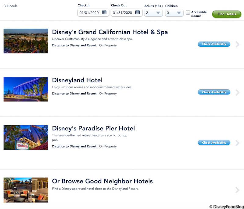 Guests can choose from the Disneyland Hotel, Grand Californian, Paradise Pier, and the Good Neighbor hotels in the surrounding Anaheim area.