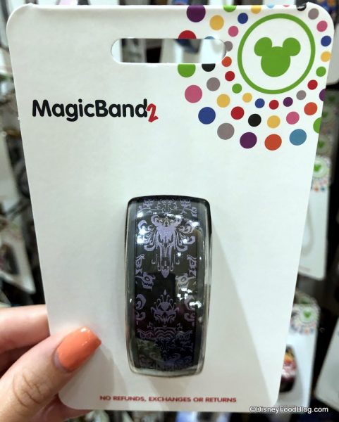 In The Emporium, we found a new Haunted Mansion Wallpaper Magic Band ($24.99)! We’ve previously seen other versions of this band with purple and gray backgrounds.