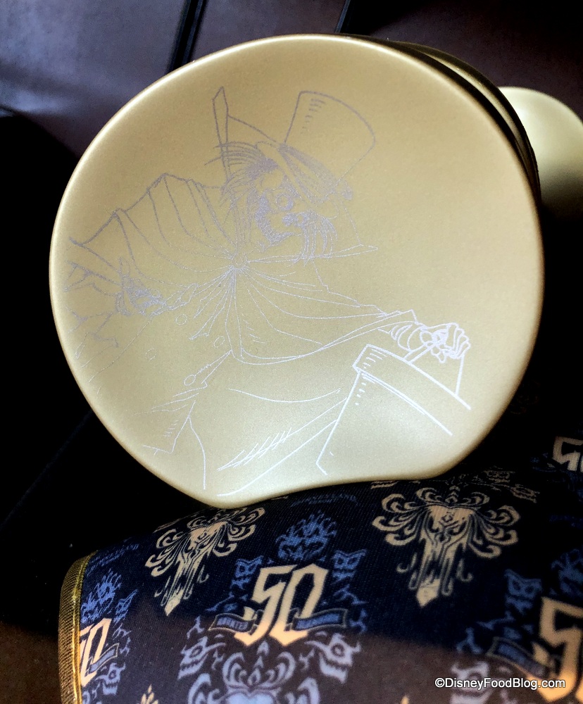 Since we’re big coffee drinkers, we had to snap a quick photo of The Haunted Mansion Anniversary Mug! The black mug features etchings in the background, but the ride’s 50th-anniversary logo is front and center.