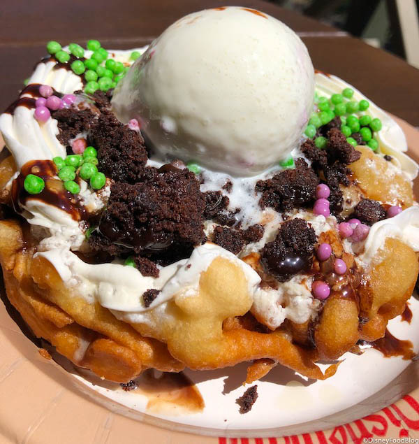 And honestly, it’s a funnel cake that we’ve been dying to meet because it was SO stinking GOOD! We loved the chocolate flavor…but our favorite part had to be the hint of raspberry! The ice cream tasted much more like vanilla than raspberry, but we didn’t mind!