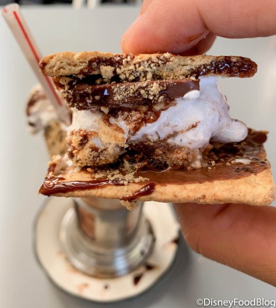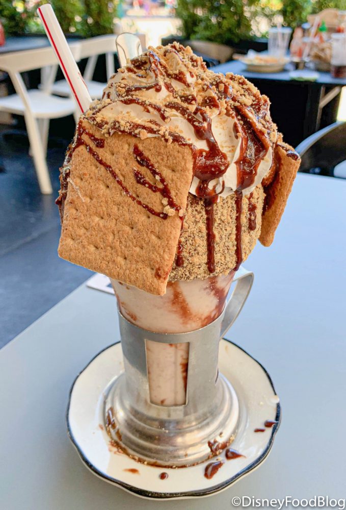 The shake is topped with whipped cream, chocolate drizzle, two classic s’mores, and has a chocolate frosted rim covered in crushed graham crackers.