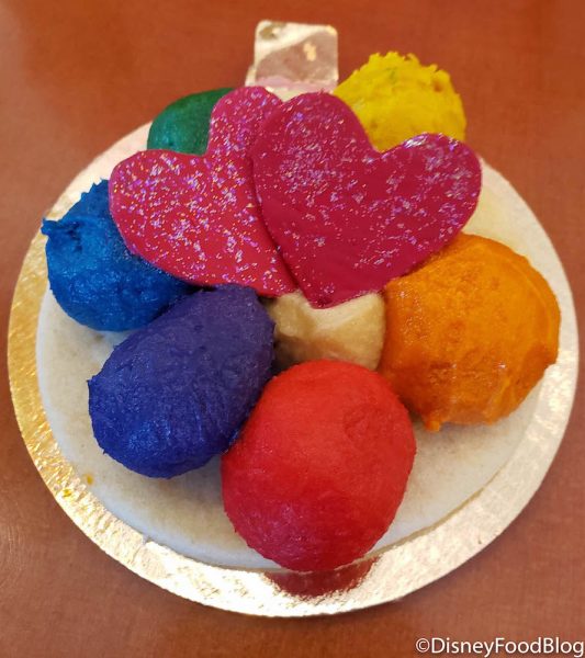 According to DFB friend Abigail W., the latest dessert at the resort is made of assorted colored pieces of cookie dough placed on a cookie round. Two adorable hearts top the treat, making us somehow love cookie dough even more (if that’s possible). Thanks for giving us the deets, Abigail!!