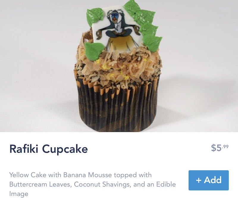 The Rafiki Cupcake is a yellow cake with banana mousse. It’s topped with buttercream leaves, coconut shavings, and a white chocolate Rafiki picture.