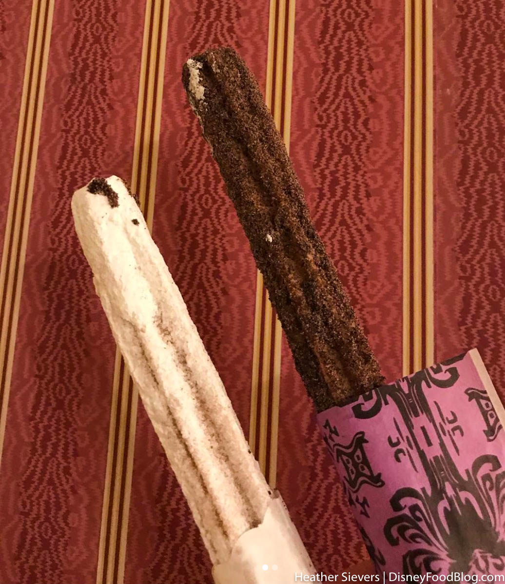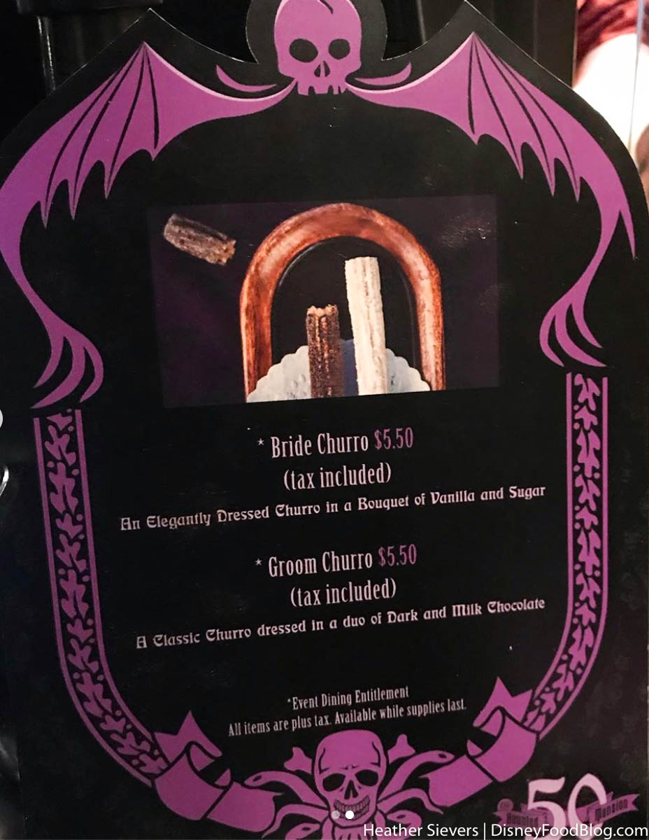 For those of you who don’t know, The Haunted Mansion turned 50 last week and Disneyland released a slew of treats to celebrate. A few of these include the Swinging Wake Cake and the Haunted Mansion Rice Crispie. But now, we’re back to share a bit of information on the Bride and Groom Churros.