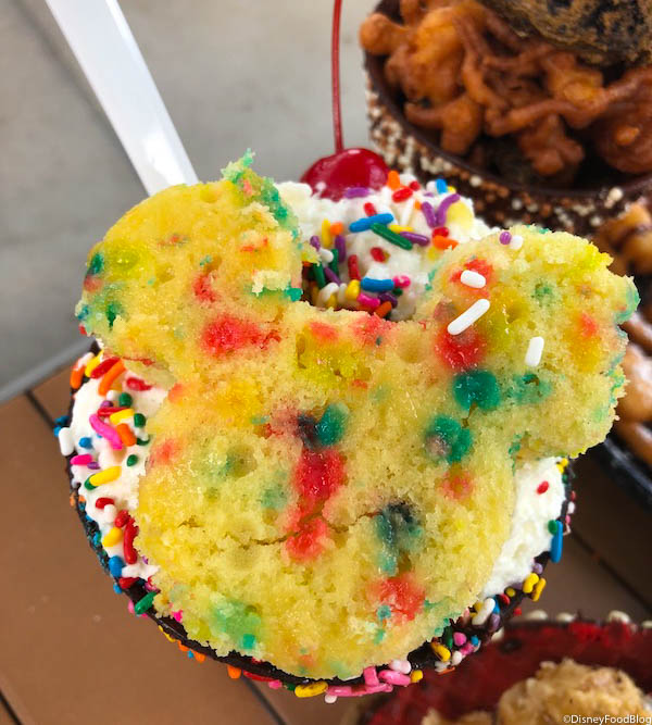 Next, we tried the Celebration Parfait for $8. This one features layers of Celebration Cookie Dough and Celebration Mickey Cake, vanilla custard, strawberries, sprinkles, whipped cream, and a cherry.