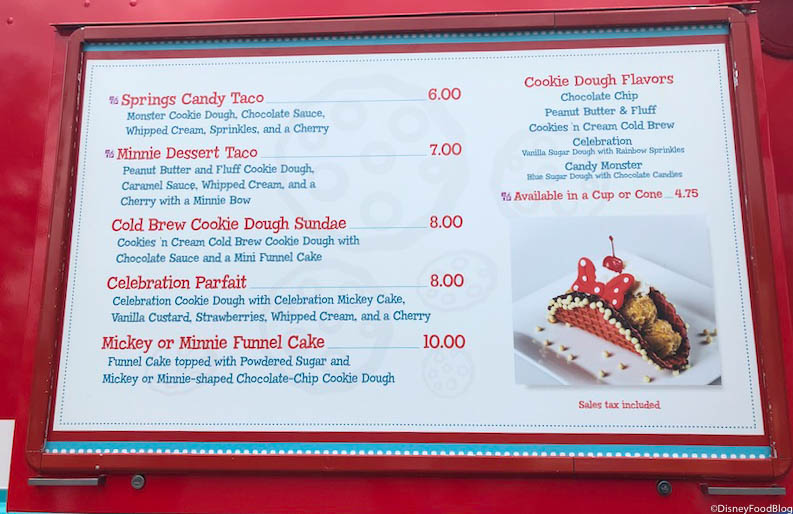 For the purposes of this review, we’re going to talk about the five main treats — the Springs Candy Taco, the Minnie Dessert Taco, the Cold Brew Cookie Dough Sundae, the Celebration Parfait, and the Mickey (or Minnie) Funnel Cake.