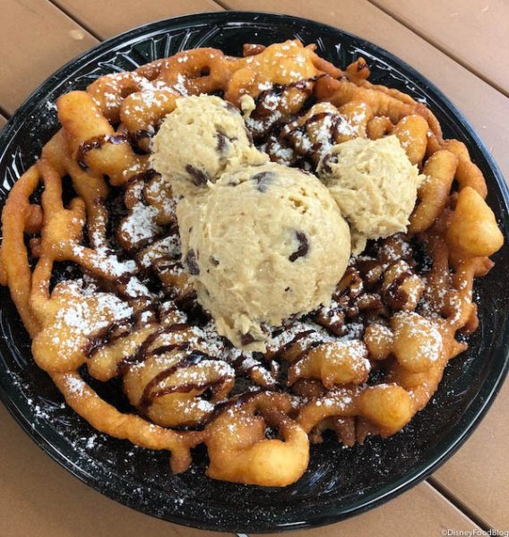 Lastly, we grabbed the Mickey Funnel Cake for $10. The funnel cake is topped with powdered sugar and Mickey-shaped Chocolate-Chip Cookie Dough. We had the choice between a Mickey or Minnie funnel cake, and the Minnie version features a white chocolate bow on top.