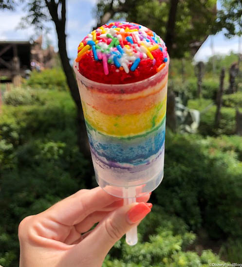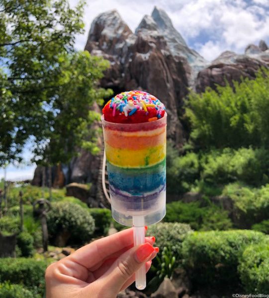 Over the past few days, we have shared info on the Razzle Dazzle Sundae, the Rainbow Cupcake from Hollywood Studios, a Pride Strawberry Dole Whip Cone, and more! Now, it’s time to review what might be our FAVORITE of the rainbow treats circulating around Walt Disney World — the Rainbow Push-Pop from Thirsty River Bar and Trek Snacks.