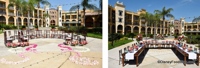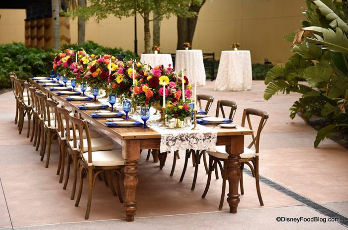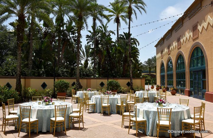 La Mesa Patio is a half-circle-shaped outdoor space off the Monterey meeting rooms in the main convention space. The Patio features the option for twinkling lights overhead for nighttime events, and it’s set up in Disney’s promotional shots with large round reception-style tables.