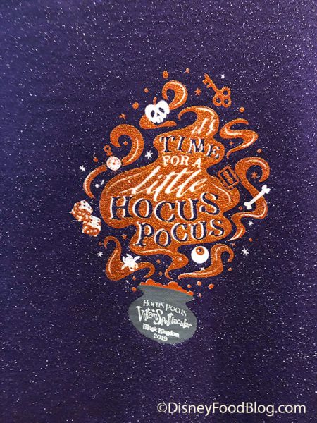 They have a colorful print covered in all three sisters and a few other spooky-fun items. And the side of them reads Magic Kingdom.