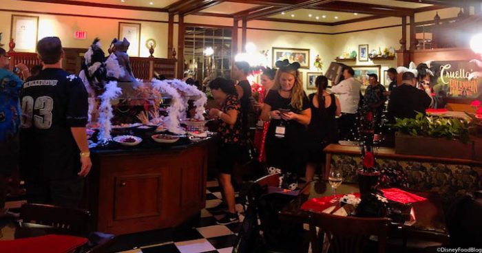 Betsy, Cruella’s Hide-A-Way is a separate cost from the Halloween Party. Only those who reserve a spot at Cruella’s can meet her there. The meal is a buffet-style with the food items pictured in this post. You can come and go as you please throughout the Hide-A-Way timeframe (9:30 to 12:30).