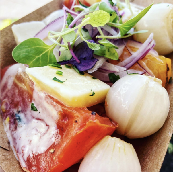 This salad is made with red onions, aged Vermont cheddar, and pickled pearl onions. It’s served with a drizzle of citrus creme vinaigrette. YUMMY!