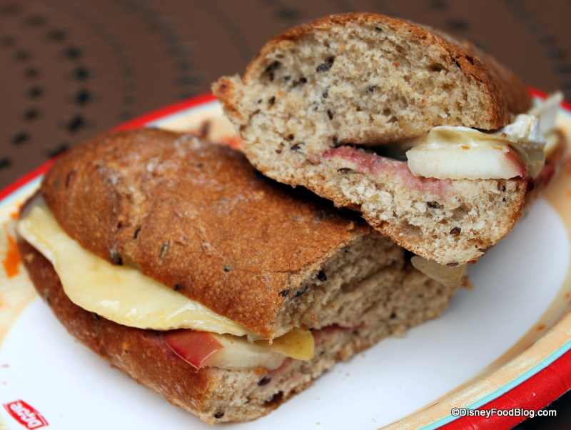 At the French bakery in Epcot, the fresh and aged cheese on their entrées and sides ranging from $3.95- $9.75 are seriously delicious. One of our favorites is the Brie Aux Pomme, or Brie and Apple Sandwich.