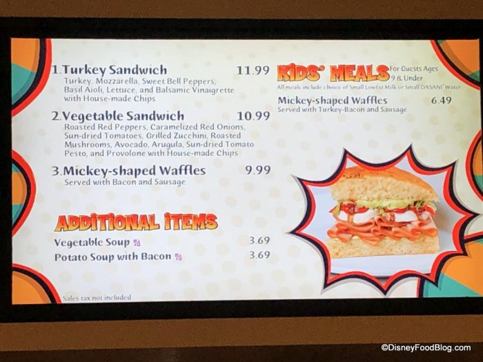 Chicken Noodle and Tomato Basil soups have been removed from the menu, but the Vegetable Soup and Potato Soup with Bacon are still on the menu at the same price. There were several price changes, though. The Turkey Sandwich has increased in price from $10.99 to $11.99, while the Mickey-shaped Waffles increased from $8.29 to $9.99.