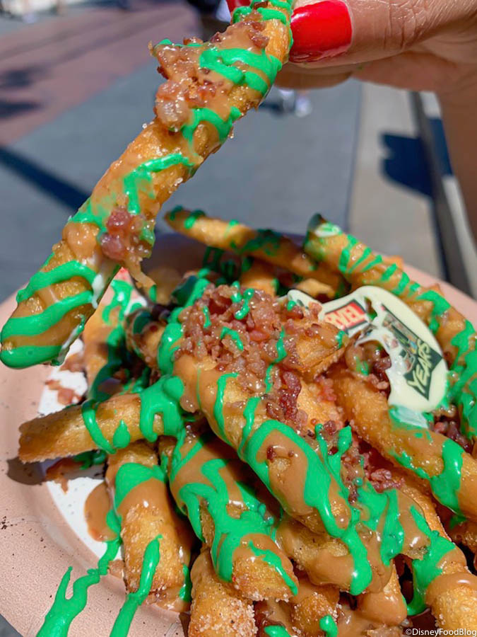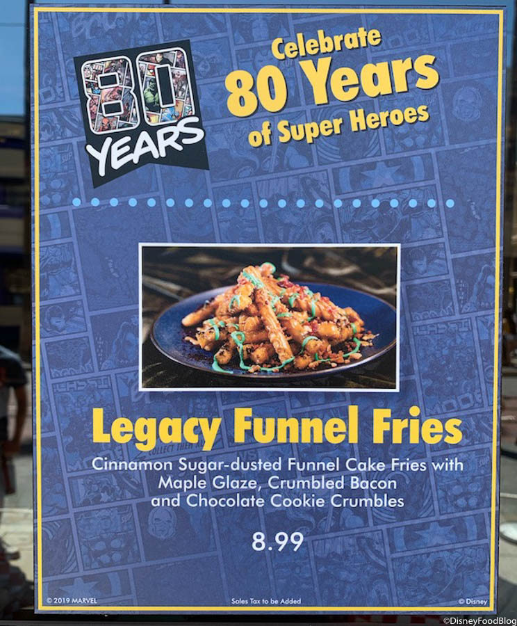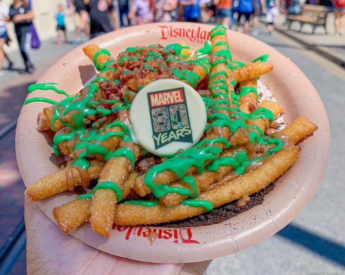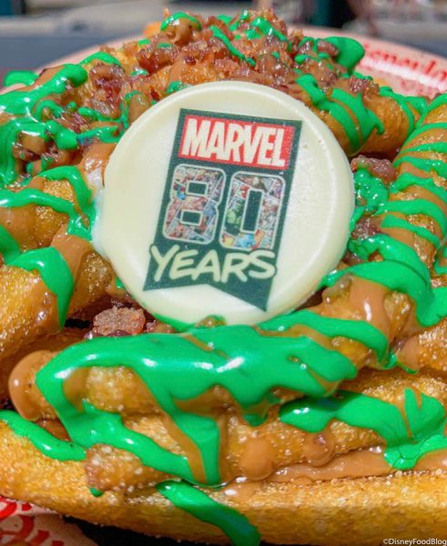 The Legacy Funnel Cake Fries are celebrating 80 years of Super Heroes. They are funnel cake fries dusted with cinnamon sugar and topped with maple glaze, bacon bits, and chocolate cookie crumbles. They also have a white chocolate “Marvel 80 Years” medallion on top!