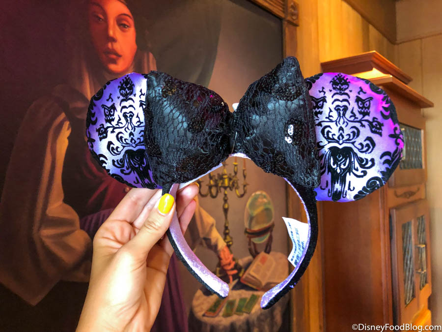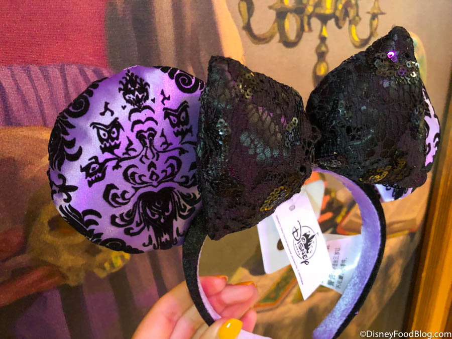 This pair of ears features the attraction’s iconic purple wallpaper and a lacy black bow.