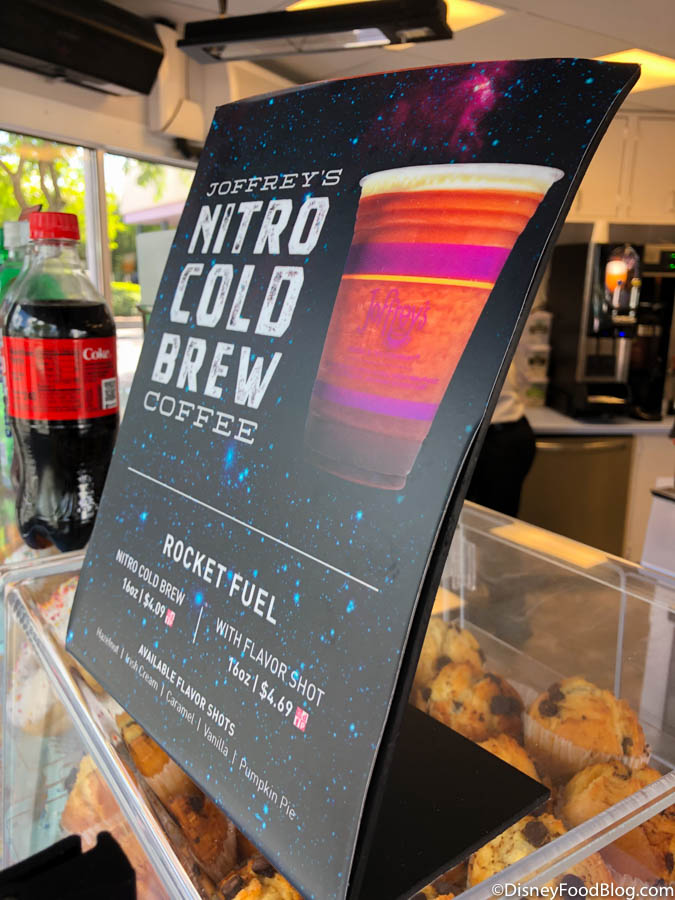 Over at Joffrey’s Revive in Tomorrowland, we came across Rocket Fuel, their nitrogen cold-brewed coffee. It was available for $4.09 (or a Disney Dining Plan snack credit) without a flavor shot or $4.69 (or a snack credit) with a flavor shot.