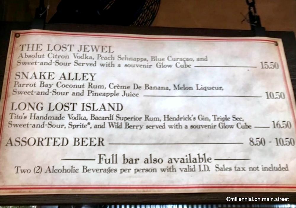 The Lost Jewel ($15.50) looks like it will be another sugary-sweet addition to the ever-popular glow cube beverages around the parks. It consists of Absolut Citron Vodka, Peach Schnapps, Blue Curaçao, and Sweet-and-Sour.