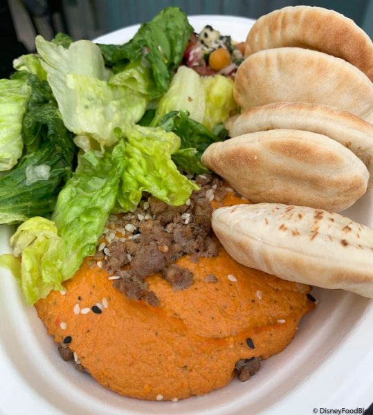 We were upset when we noticed the lack of pita served with the overwhelmingly large portion of hummus. But, to our surprise, a Cast Member was happy to give us some more! This may not happen every time, but we sure are thankful it happened this time!