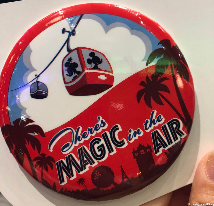 The new Skyliner buttons come in red and blue and are perfect for sharing since there’s two in a pack. The red one reads, “there’s magic in the air” with an image of Mickey and Minnie soaring over the parks.