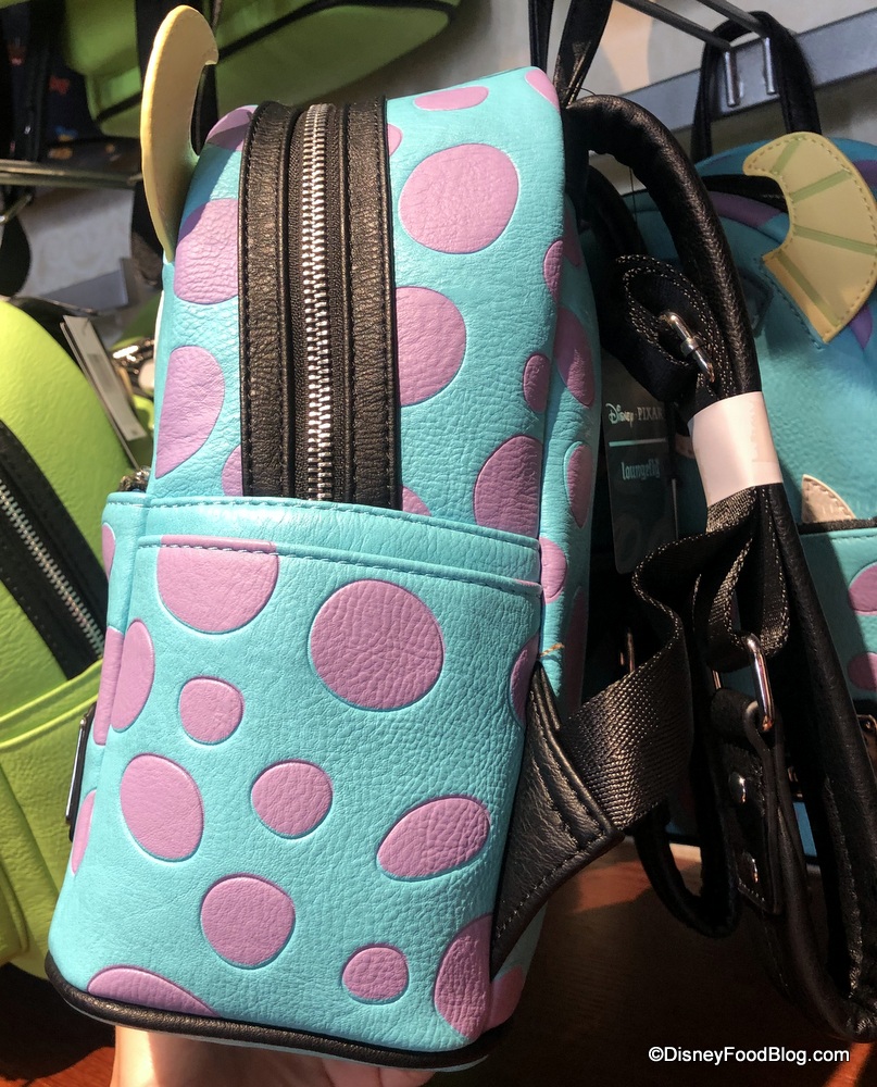 The Sulley backpack is bright turquoise and features his signature purple spots, blue eyebrows, and tan horns.