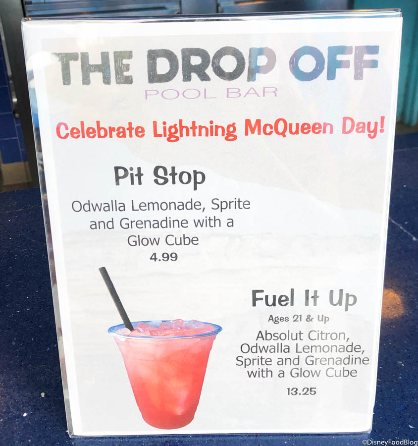 It’s Lightning McQueen Day! And the Drop Off Pool Bar at Disney’s Art of Animation Resort is celebrating in Radiator Springs style by offering some fun Cars-themed drinks!