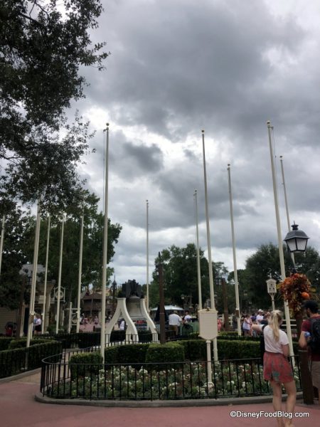 Before we dive in, we just want to give you a bit of a glimpse of what we experienced yesterday. Due to the stormy skies, many of the park’s flags had either been removed or rolled up.