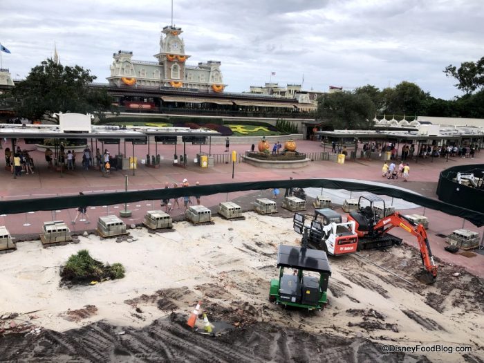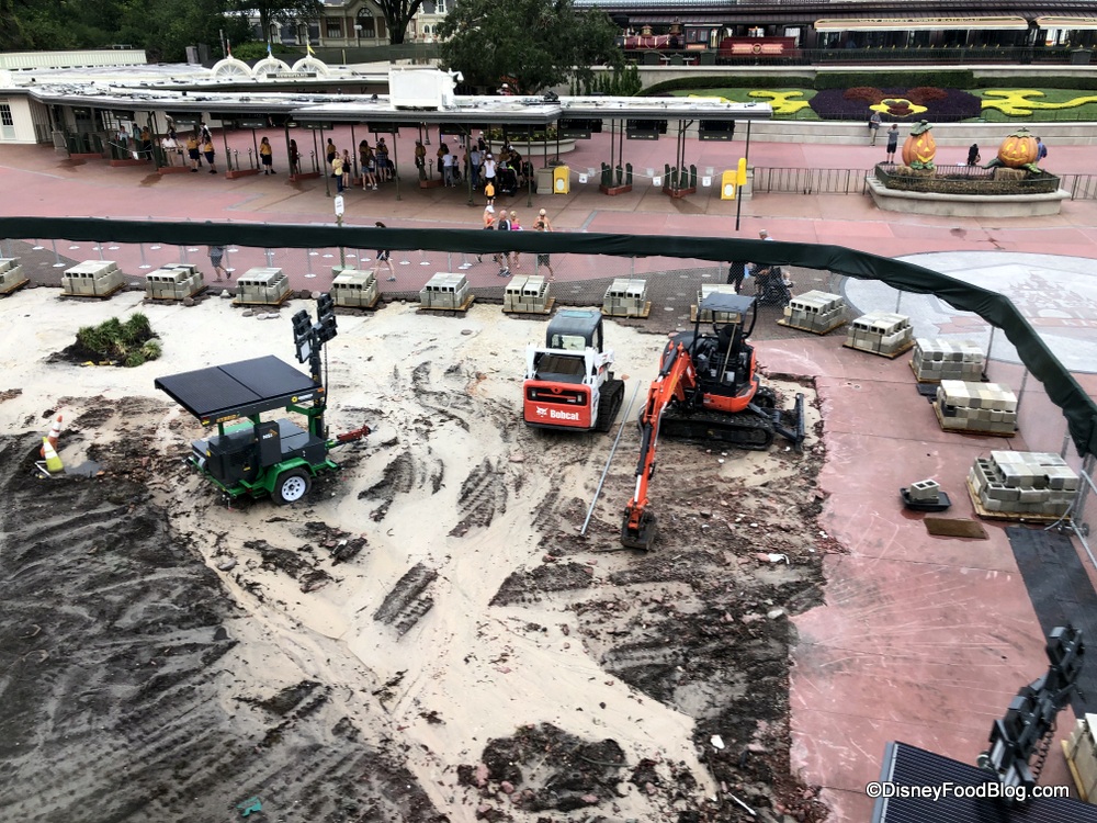 Construction work continues around the entrance to Magic Kingdom. It looked like most — if not all — of the Disney’s Walk Around the World bricks had been removed in the blocked off area.