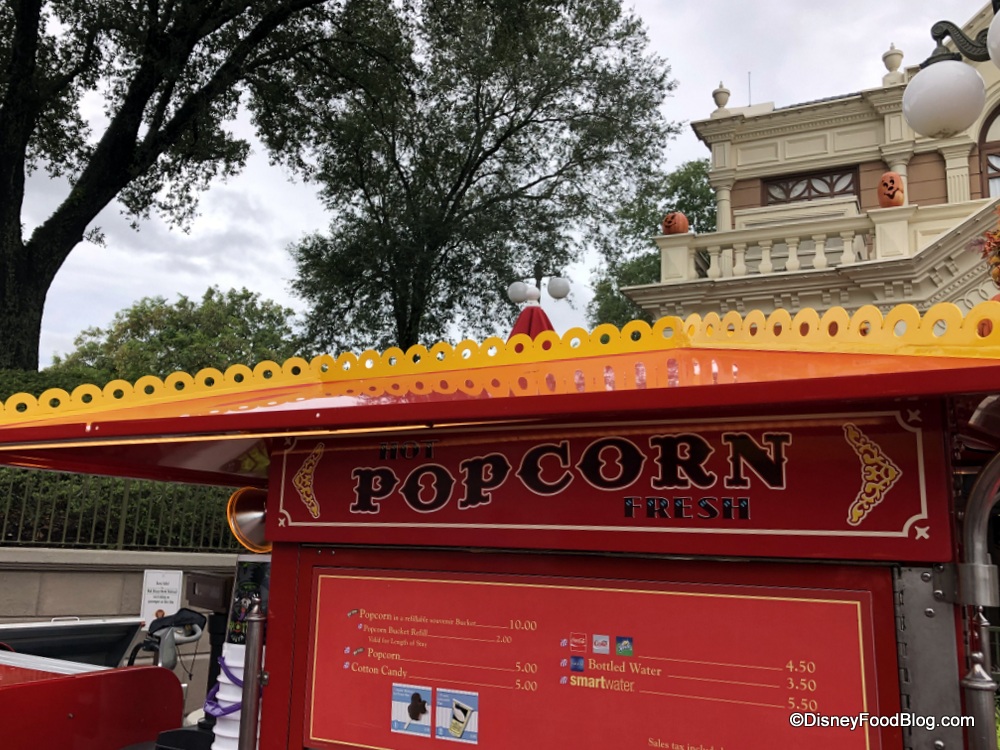 While we were walking down Main Street, U.S.A., we noticed a yellow decoration we didn’t recognize on the top of the popcorn cart. A Cast Member mentioned it was added a while back, but the umbrella that is usually up and open covers the top of the cart.