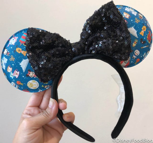 These limited release ears feature a sparkly black bow, black headband, and blue vinyl ears decorated with cartoon characters and attractions from the parks! (ADORABLE.)