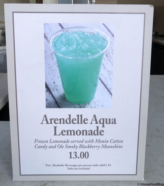 The Arendelle Aqua Lemonade ($13.00) is a frozen lemonade with Monin Cotton Candy and Ole Smoky Blackberry Moonshine.