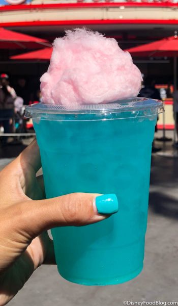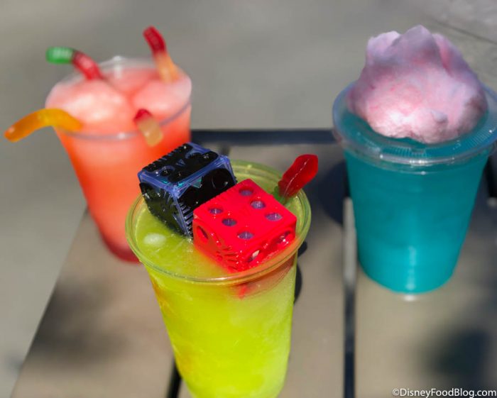 The higher cost is likely due to you getting 2 unique dice shaped glow cubes, but it still seems pretty steep! The drink is a Midori and limeade slush with gummy worms. You can spot this drink over in Disney World at Mickey’s Not-So-Scary Halloween Party in September too! It tasted pretty good, but we’d likely choose My Bugs! My Bugs! again over this one unless we were dying to get those dice!