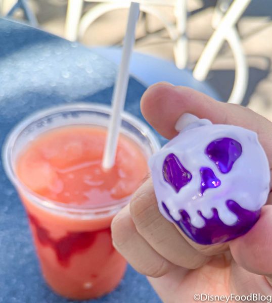 The Blood Orange Slush is blended with raspberry syrup and topped with a blinking poison apple (it kinda looks like Darth Vader’s melted mask, doesn’t it?).