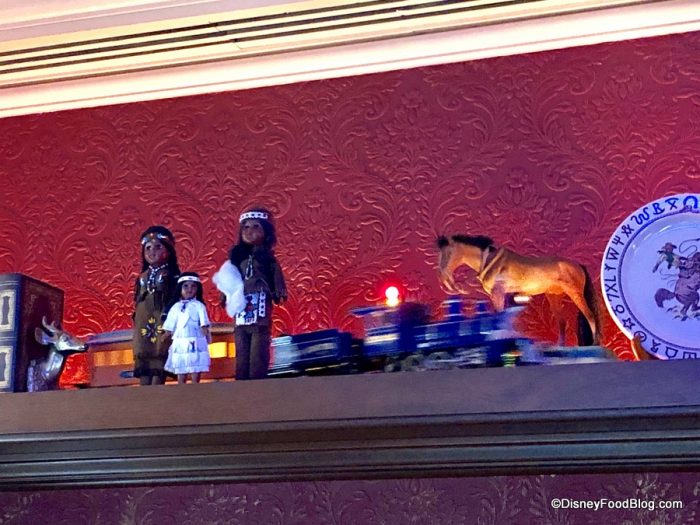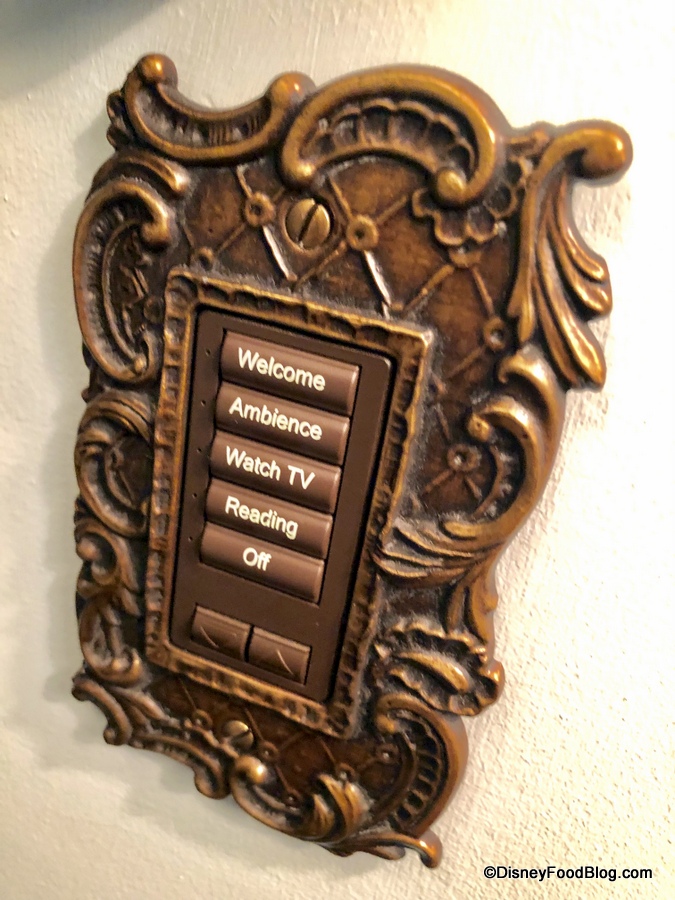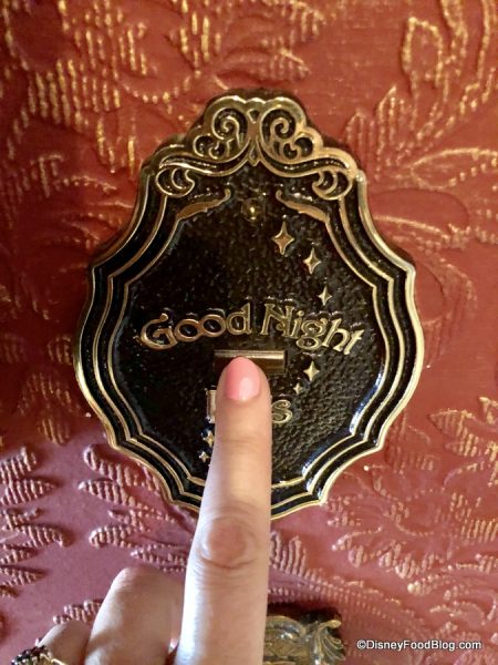 The Frontierland Bedroom also has a Good Night Kiss button that diners are encouraged to press. In this room, that perimeter shelf comes to life…