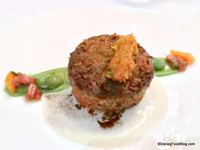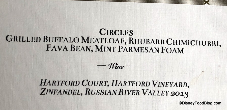 The next course was simply called Circles, but don’t let the simple moniker fool you: it was a complex dish. It was Grilled Buffalo Meatloaf with Rhubarb Chimichurri, Fava Bean, and Mint Parmesan Foam.