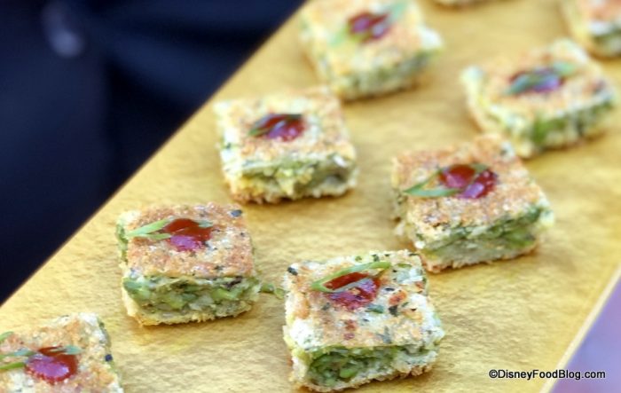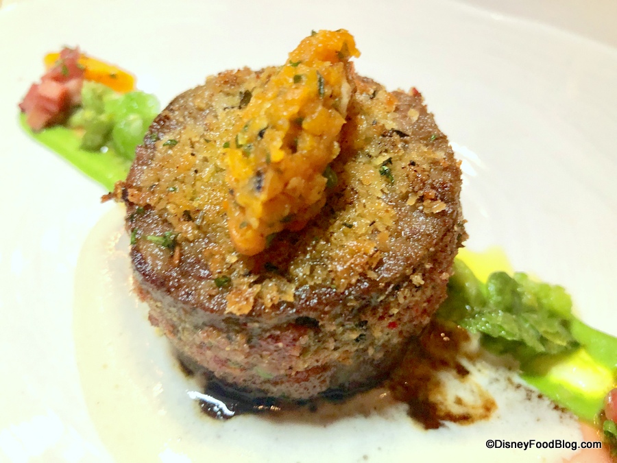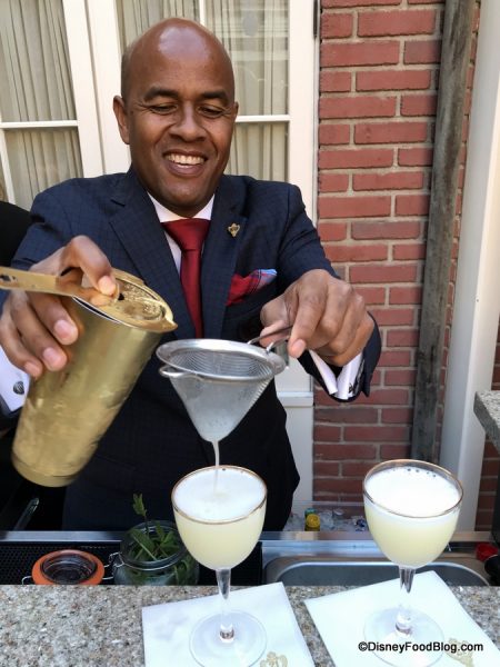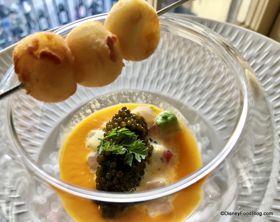 The presentation here is pretty fascinating. It’s a sugar globe encasing the mousse sphere. We’ve seen this presentation before (DiningInDisney had something similar at a Haunted Mansion-inspired meal for Club 33, also helmed by Chef Clint Chin whom you’ll see below), but it’s still impressive.