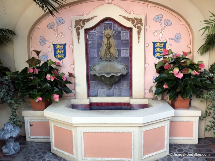Diners can take some time to explore all the details out in the Courtyard, including this stylized fountain, and the feeling is light and bright and relaxed.