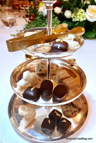 A tiered tray of chocolates, cookies, and caramels was also brought out during the dessert course. Of particular note was the salted caramel. It was creamy and salty and sweet, and we savored these with cups of tea and coffee.
