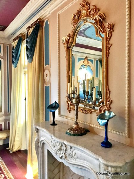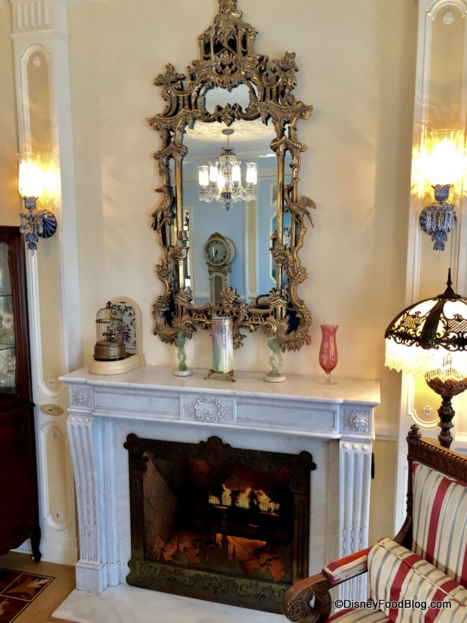 The ornate mirror over the fireplace isn’t as intricate as the one in the Parlor, but this mirror has a little (read: totally amazing!) secret.