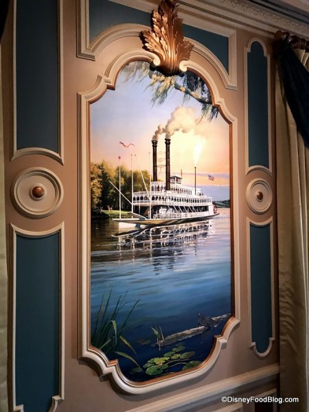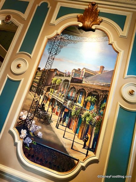 The Neuschwanstein Castle (left) and the Chateau de Chenonceau (right) are said to have inspired Sleeping Beauty Castle and Cinderella Castle, but whether that lore is true or not, these murals do lend a sense of history to the room.