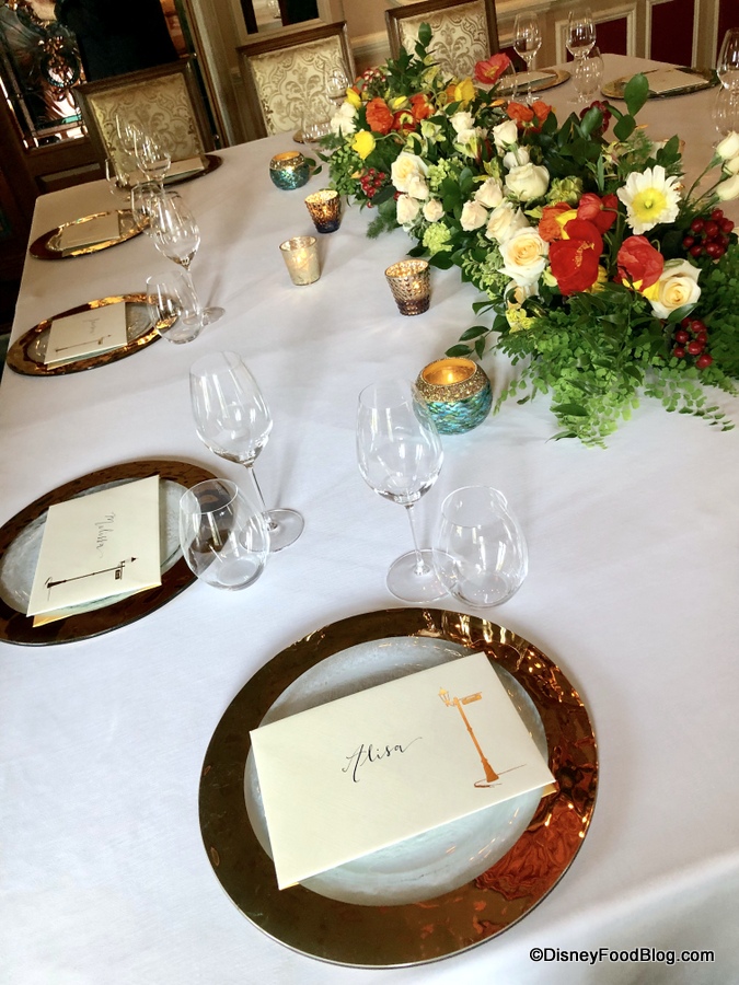 Place settings include a gold-rimmed charger, wine glasses, and sealed envelopes that contain the night’s menu.
